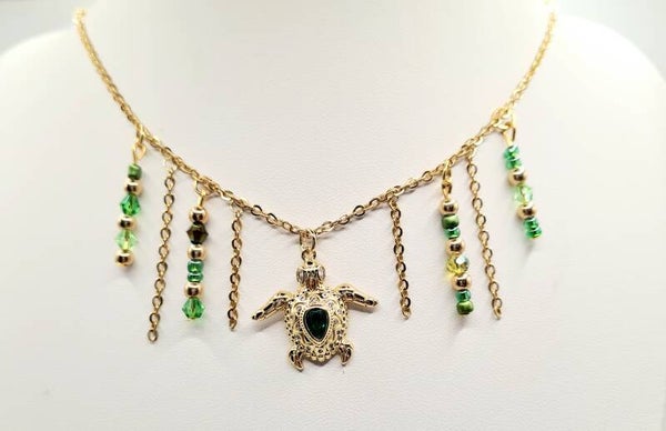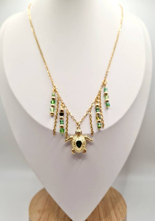 Ketting gold plated 18k met schildpad en hangertjes smaragd groen