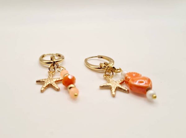 Goudkleurige oorbellen met oranje bedeltjes en zeester