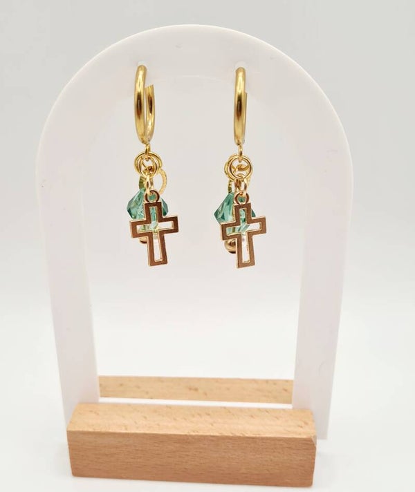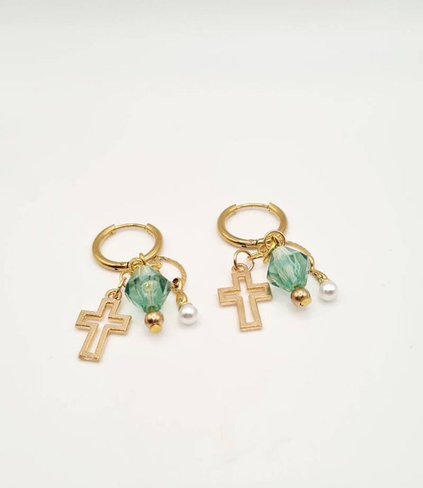 Goudkleurige oorbellen met kruisje-parel en groene kraal