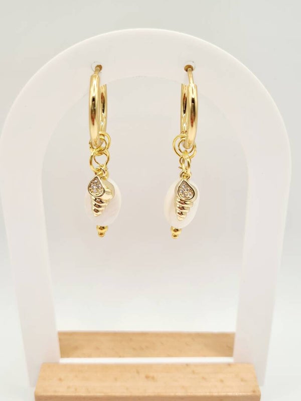 Deze elegante oorbellen hebben een verfijnde zeeschelp bedel welke ook 18k goud verguld is net zoals de oorringen. De bedeltjes zijn verwisselbaar waardoor je bijvoorbeeld ook alleen de zeeschelp of alleen de parelmoerkleurige bedel kan dragen.