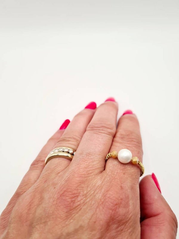 Prachtige parel stainless steel ring met oud roze facetkralen.