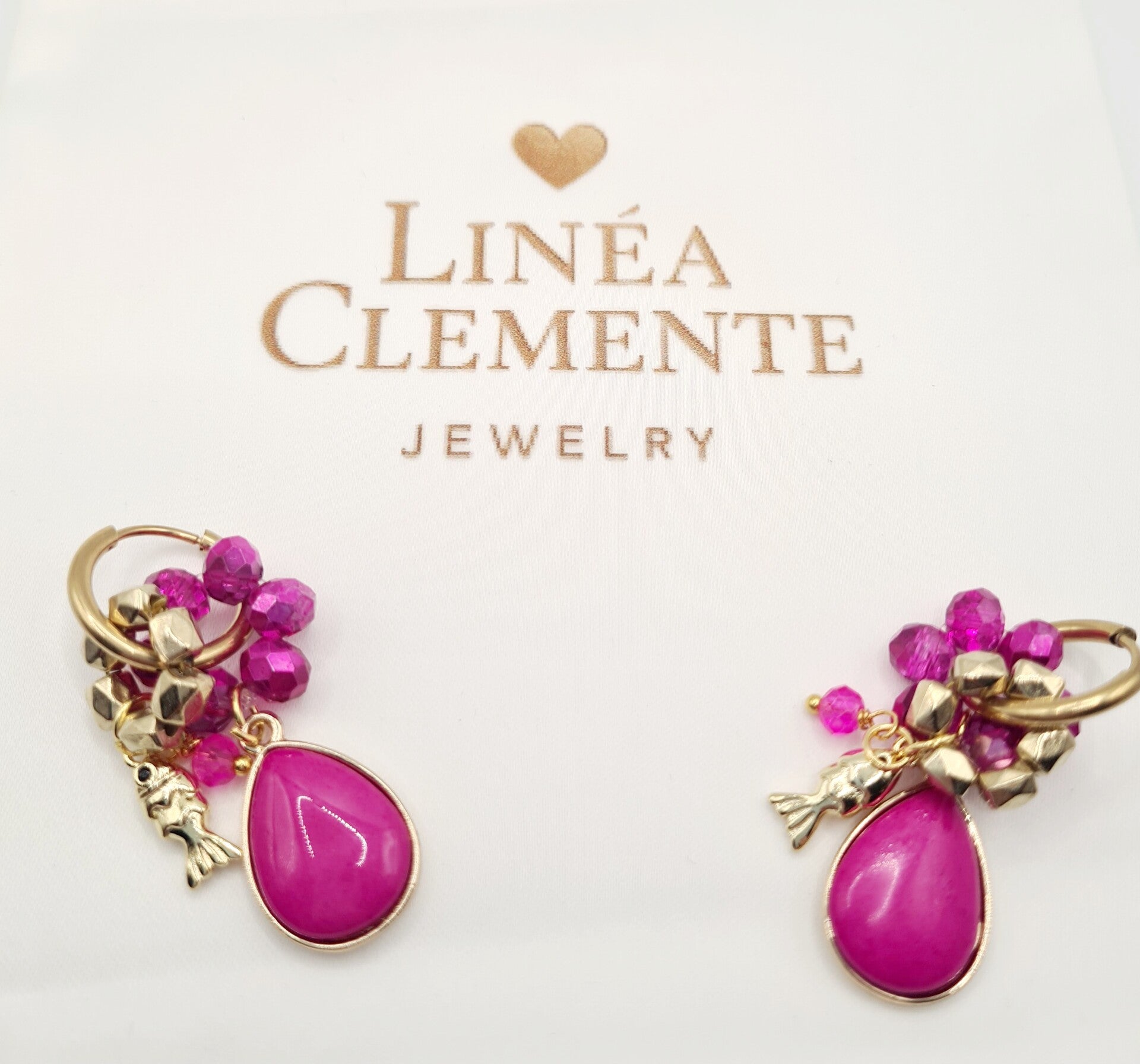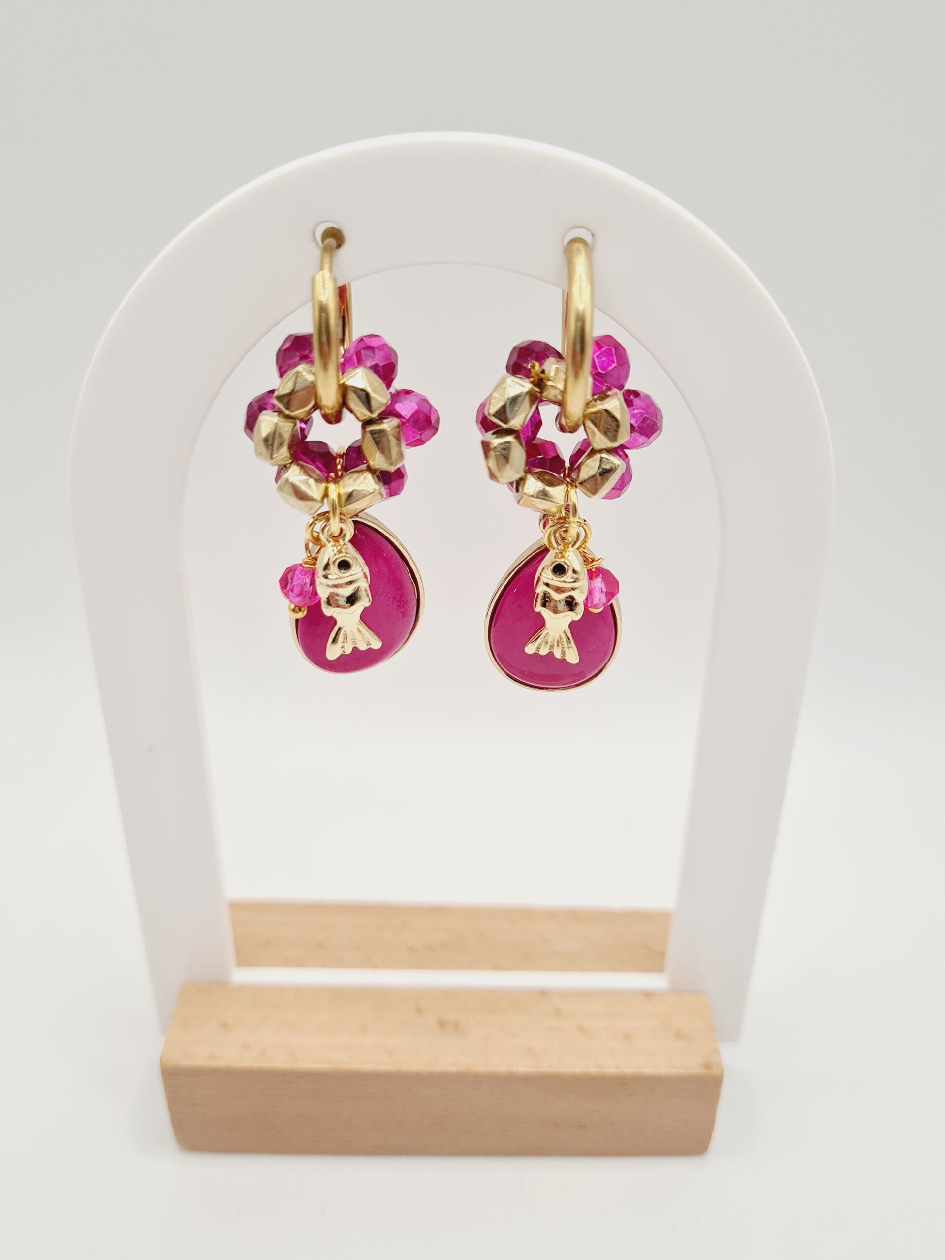 Geweldige set oorbellen. Door de verwisselbare bedeltjes heb je 3 sets boor 1 prijs. Zo kun je ze combineren of juist alleen de fuchsia bedels of gouden bedels dragen.